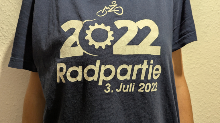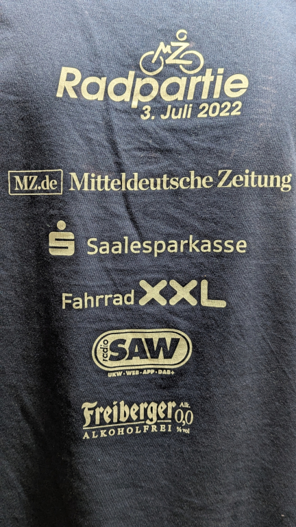 Auf dem Weg dorthin, kurz nach dem Bahnhof, sah ich die erste Frau mit dem typischen T‑Shirt mit Aufdruck auf dem Rücken, das man nach der Anmeldung erhält und das einen visuell als Teilnehmer ausweist. Als ich ungefähr auf gleicher Höhe mit der schon etwas älteren Dame war, sagte ich freudig zu ihr: „Eine Mitstreiterin!“, sie daraufhin: „Ach nee … Da waren schon viele.“ Ich habe ihr dann erklärt, dass sie aber für mich die erste erkennbare war, da ich an dem Tag sonst noch niemanden mit einem Radpartie-Shirt gesehen hatte.